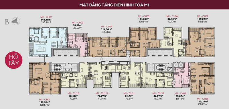 • Căn hộ 3 phòng ngủ: 100 → 129 m2